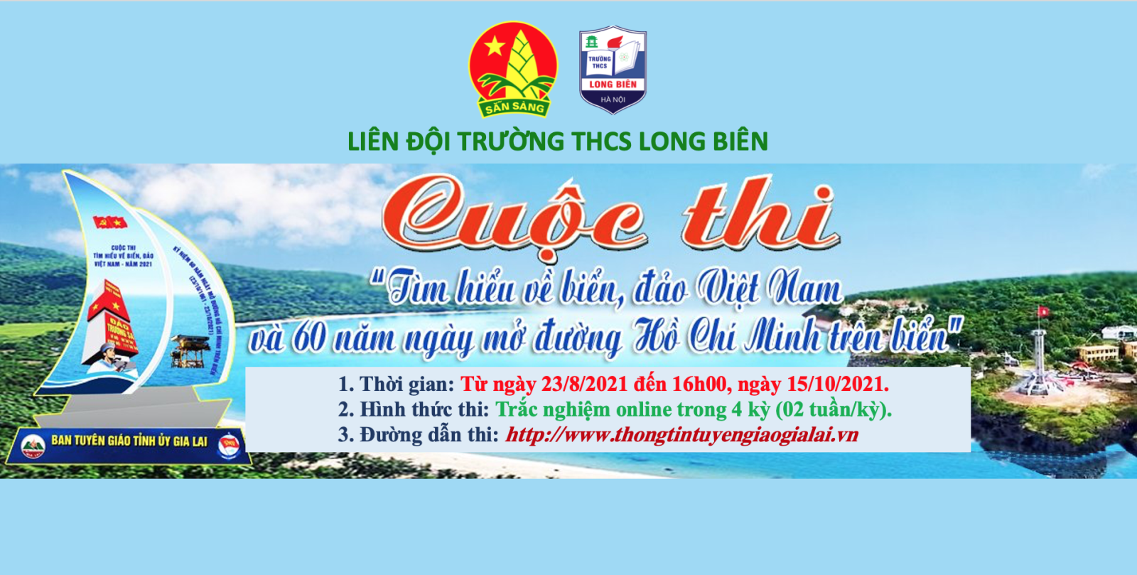 Hưởng ứng các hoạt động chào mừng kỷ niệm 60 năm Ngày mở đường Hồ Chí Minh trên biển (23/10/1961 - 23/10/2021), trường THCS Long Biên tổ chức Cuộc thi “Tìm hiểu về biển, đảo Việt Nam và 60 năm Ngày mở đường Hồ Chí Minh trên biển” theo hình thức trắc nghiệm online. Đối tượng tham gia thi là các em học sinh trong nhà trường. Người dự thi có thể thi trắc nghiệm online qua trang tin điện tử Tuyên giáo Gia Lai: http://www.thongtintuyengiaogialai.vn.