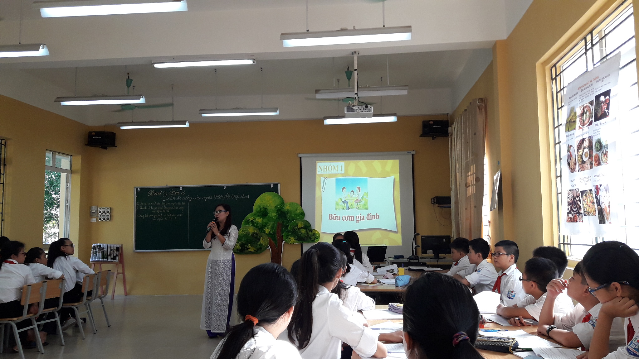 Không gian lớp học được trang trí gần gũi, thân thiện, làm nổi bật chủ đề bài học mà cô và trò lớp 6B cùng tham gia: Cách ăn uống của người Hà Nội.